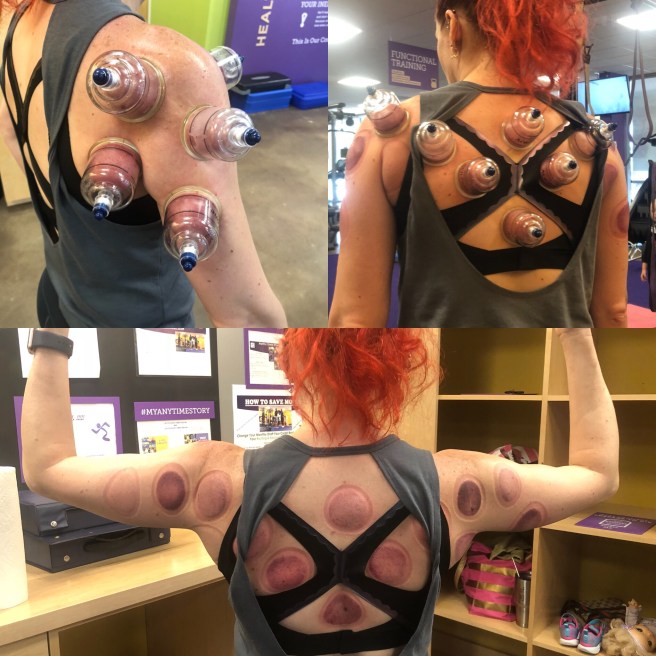 Cupping!! It’s basically a form of acupuncture so it helps to loosen the muscles, get the blood flowing, etc. and, in turn, aids in the repairing of the muscle. I initially tried it for a non-lifting related shoulder injury that was just not healing at all after months. After one session of cupping I was able to raise my arm and to reach back (like to swat my girls in the backseat when they began to act a fool..LOL), after a second session a few weeks later I had full mobility back. I am definitely a believer now. The initial suction doesn’t always feel so great but after a few moments it stops sucking..LOL, I had to..and instead of the pinching feeling you just feel everything relax. It’s pretty crazy. And the marks generally only last a couple to a few weeks so not big deal. I’m not saying it is for everyone but for me, I love it! Best deep tissue massage ever! I am always asking my husband to massage my shoulders because along with lifting heavy I also carry my stresses of life in my shoulders so when I ask him to massage my shoulders I always tell him I wish he could just pull up my shoulder blade and really get in and under there. Haha When those cups were placed on my back around my shoulder blades this morning I was braced for the sucking pinching that I get on my arms and shoulders…it never came. It felt SO good! I was so relaxed. Don’t knock it til you try it. 😉